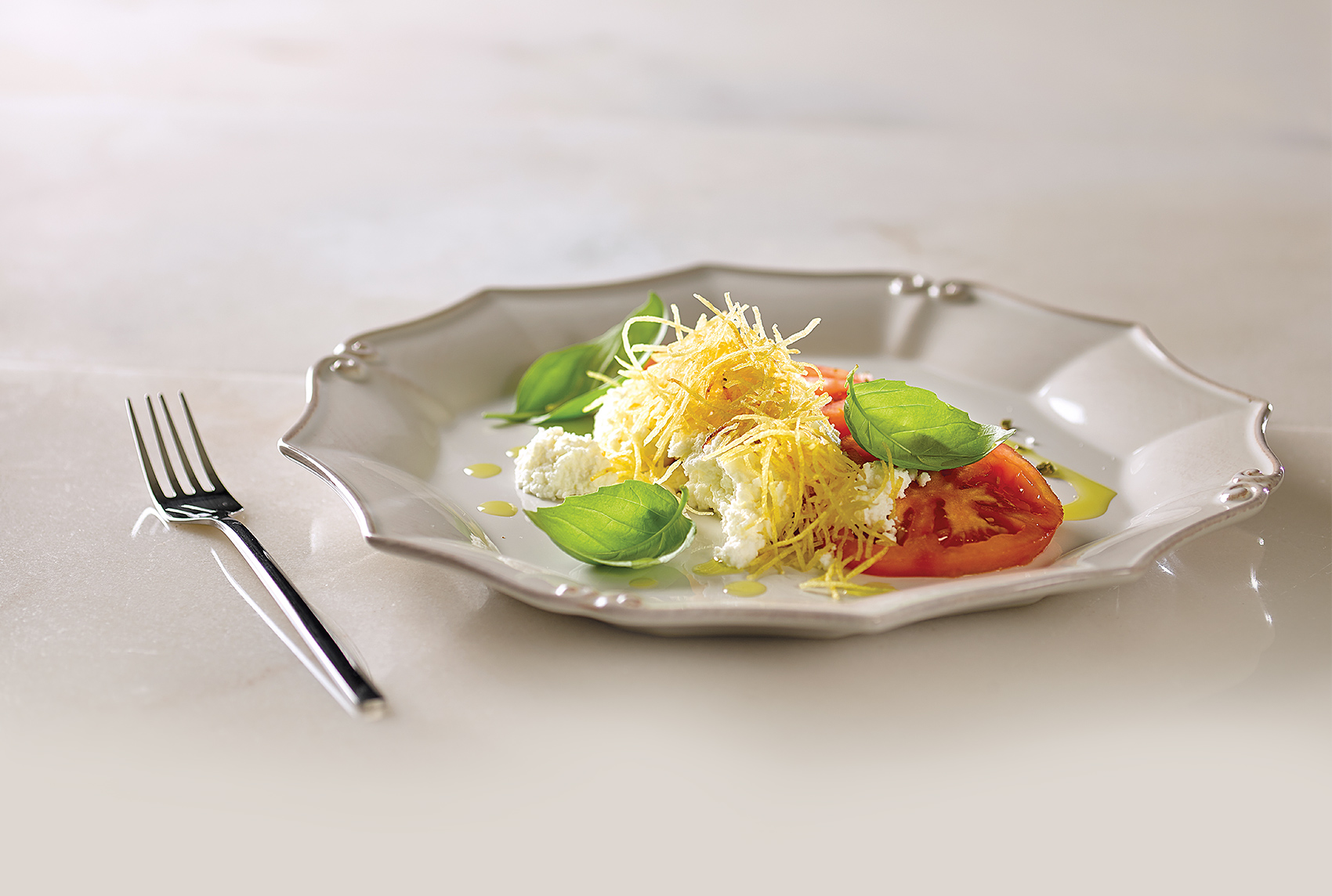 Season with salt, add the seedless tomato, mix in the white wine, cover and let it simmer. Blend the mixture, bring it back to boil and add the squid, letting them stew slowly in the sauce. Serve the squid with a bit of sauce, garnish with the blanched vegetables, parsley, and Palhíssimas.
